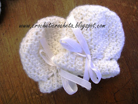 Voilà! J'ai enfin fini la parure de naissance pour la petite demoiselle qui va bientôt pointer son nez! Des petites mouffles toutes simples, réglables grâce au ruban, rapides à crocheter, assorties au bonnet et aux ballerines, que demande le peuple?! La boîte, Cathy! La boîte!