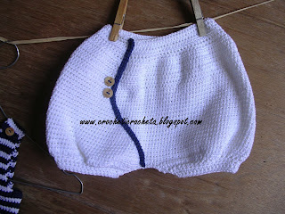 Le bloomer a un élastique à la taille et est ouvert à l'entrejambe, trois boutons pressions le ferment une fois que le petit d'homme et sa couche (eh oui j'ai aussi pensé à l'épaisseur de c't'engin là!) sont à l'intérieur bien entendu ;) Une bordure crochetée en bleu marine rappelle le top.