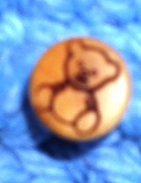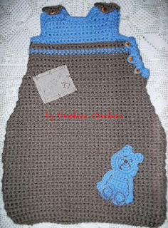Joli nid d'ange crocheté main, avec ourson en applique également crocheté et brodé main, une petite "étiquette" maison avec son prénom brodé et l'indispensable empreinte d'ours! ...et enfin les ptits boutons bois "ourson" :)