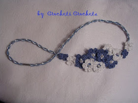…et un serre-tête élastique en torsades bleu ciel et argent, agrémenté de fleurs bleues et blanches/argentées au crochet by Crocheti Crocheta J
