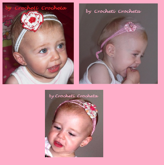 Quelques nouveautés de bandeaux et fleurs au crochet et tissu pour la foire du 19 mai... Avec mon mannequin officiel, qui a bien grandi...et d'ici peu un autre mannequin, tout aussi joli, pour les modèles femmes ;)