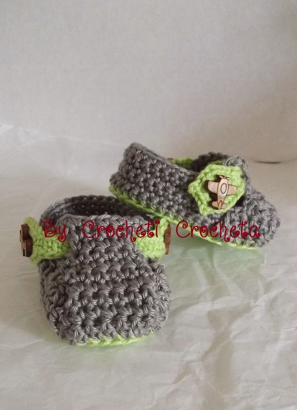 Ici une paire de chaussons en coton et aloe vera couleurs vert anis et gris métallisé avec un joli bouton en bois en forme d'avion...