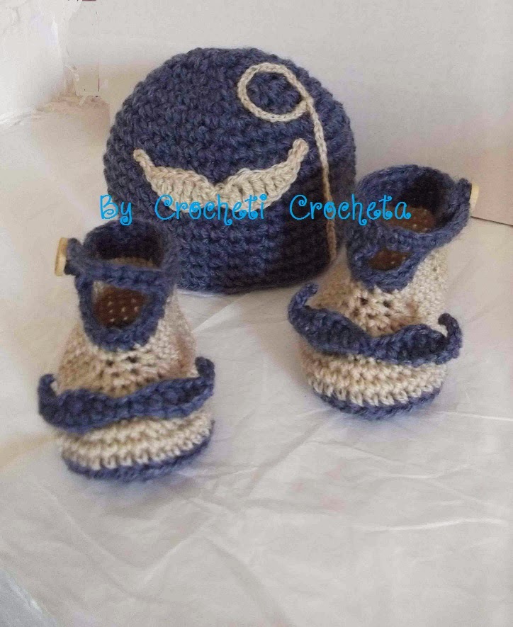 Le bonnet est décoré d'une applique au crochet cousue main "moustache et monocle"; les chaussons arborent une belle moustache bleu ;)