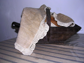 | Mon chiffon à pain, réalisé dans un tissu que ma grand-mère avait tissé, et agrémenté d'une bordure au crochet dentelle. Le tout dans mon vieux panier en bois et bonjour la ferme! |